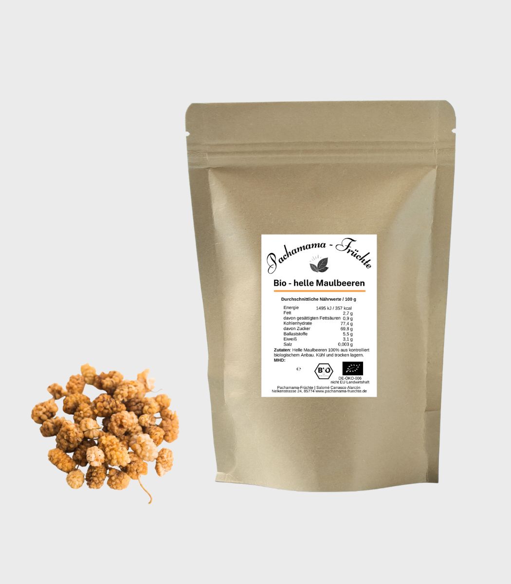 Bei Pachamama Früchte achten wir auf höchste Qualität: Unsere Bio Maulbeeren hell sind naturbelassen, ungeschwefelt und frei von Zusatzstoffen. So bleibt der ursprüngliche Geschmack der Frucht vollständig erhalten.
