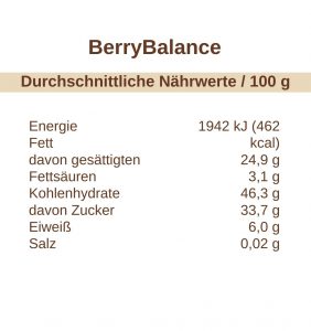 BerryBalance Bio Mix vereint 34 % saftige Weinbeeren mit Cashewkernen, Mandeln und fruchtigen Cranberries. Abgerundet durch edle Pekannusskerne entsteht eine ausgewogene Bio Nuss-Frucht-Mischung mit harmonischem Geschmacksprofil – fruchtig, leicht säuerlich und angenehm nussig.